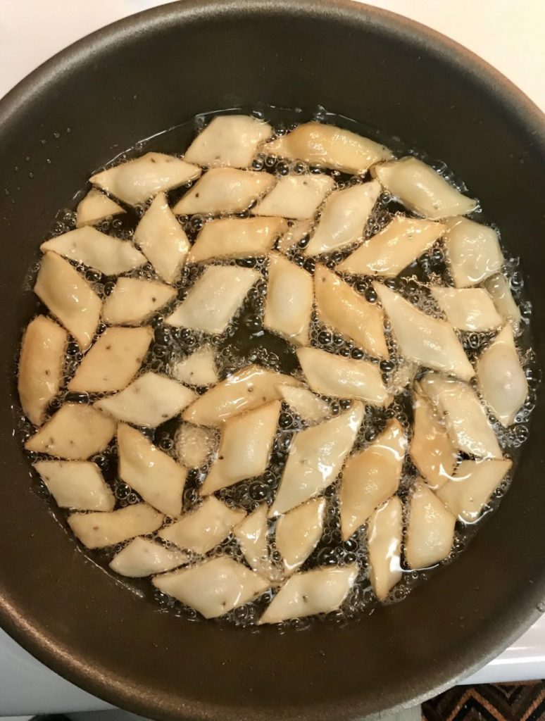 👉 Heat oil in a deep pan on medium heat. When the oil is hot enough, not smoky hot, begin to drop a few at one time. Immediately stir with a spatula. Do not crowd too many into the oil at one time. Keep stirring to fry evenly until golden and crisp. Fry them in batches.